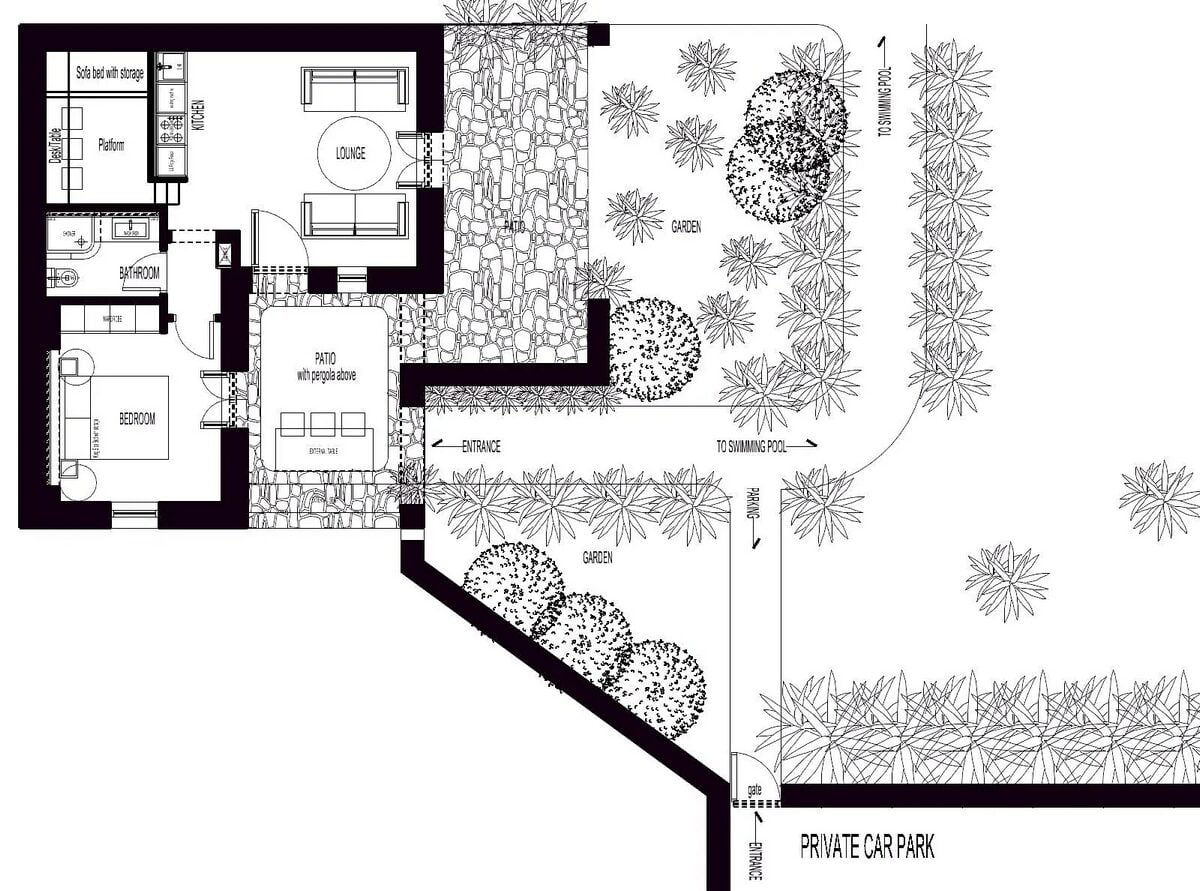 The bright and welcoming living room opens through glass doors onto the patios and is furnished with two comfortable sofas and an air conditioning unit. Adjacent to it, a raised platform provides a versatile corner with a single bed/sofa, ample storage, and a functional desk with stools, ideal for both relaxation and work. The modern kitchen is equipped with a central island that adds extra storage, making it perfectly suited for everyday use as well as entertaining. The serene, airy bedroom features a king-size bed, integrated storage, large wardrobe units with shelves and drawers, a generous mirror, and an additional air conditioning unit. The stylish bathroom completes the layout with a spacious washbasin, shelving for towels, a WC, and a shower.