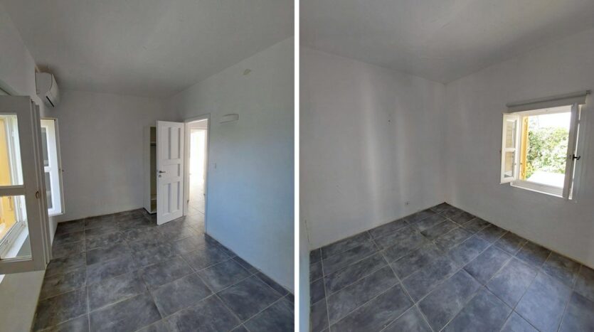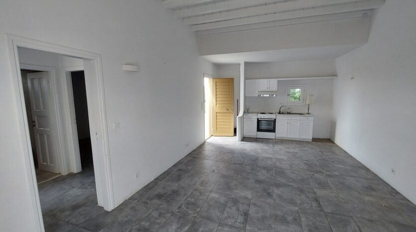 Upon entering, you are greeted by a spacious open-plan kitchen-living area bathed in natural light from a window-door that opens onto a generous balcony overlooking the interior of the complex. A door leads to two cozy bedrooms and a shared bathroom. The master bedroom boasts its own private balcony, also offering views of the complex’s peaceful interior.